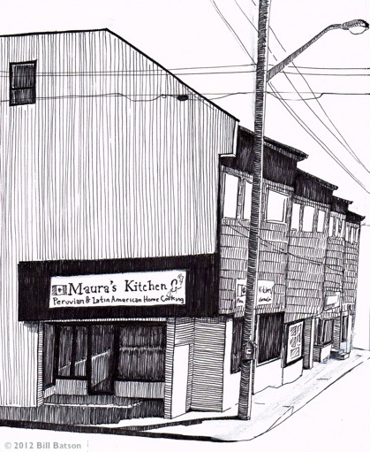 Bill Batson, an artist, writer and activist draws sketches and writes essays curbside in Nyack, NY. ‘€œNyack Sketch Log: Maura’s Kitchen’€ ©2012, Bill Batson.
