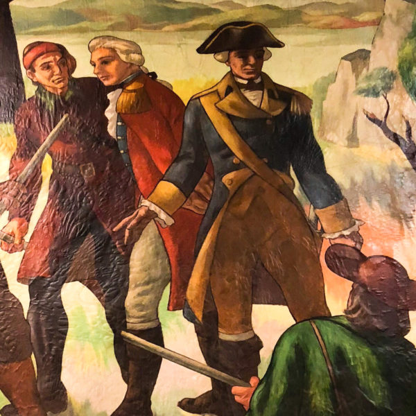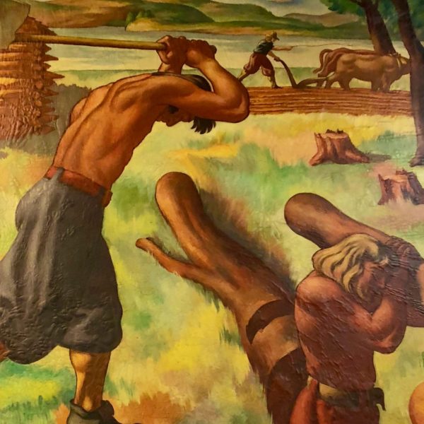 Taken together, the mural illustrates a cultural history true to its time. Hard working, white, male colonists earn the right to own land. They fight off savages and protect women. They fight and defeat the British and slavery. Their reward is hard-won prosperity. Clearly, it is a one-sided story.