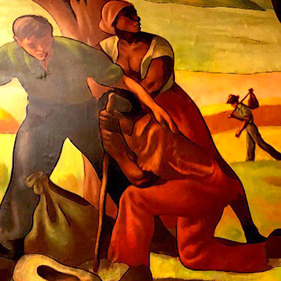The final three scenes move the history forward from the revolutionary war to the late 19th century. In a a Civil war era scene, a young African American man kneels at the feet of a farmer, and a woman stands behind the two gazing away in fear. Another figure is carrying a knapsack on a pole in the background. Is the farmer helping runaway slaves? Perhaps. It is either that or he is a post-emancipation liberator. Either way, he is depicted as a savior.