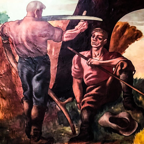 Social realism pushed the style a bit further by showing alienation and the plight of the working poor–as seen in the work of New York artists like George Bellow and Edward Hopper, as well as American heartland artists, such as Thomas Hart Benton and Grant Wood. George Bellows’ boxing paintings, with their hyper-masculine protagonists and bloodthirsty audience, is an iconic example of this style, and its hallmarks show up in the Nyack Post Office murals.