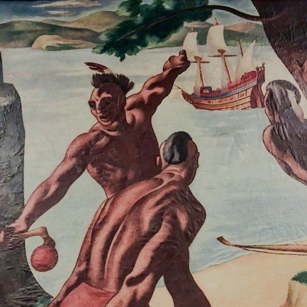 Hyper-masculine Native Americans and colonists populate the first three scenes culminating in a scene that depicts the 1634 Kieft’s War. Smith dramatizes the colonial struggle in a disturbing manner by showing Native Americans attacking  a homestead. In the background, a Native American burns the house; another is killing the plow ox; another is engaged in a mortal battle with a colonist; and another is strangling a woman and about to strike her with a tomahawk.