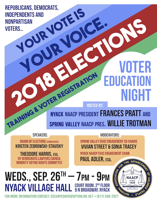 The public is invited to a Voter Education and Training session at Nyack Village Hall on Sept 26 from 7-8:30p. Sponsored by the Nyack and Spring Valley branches of the NAACP, the session will focus on ways to motivate community members to vote in the November General Election. Voter turnout, especially among minority communities, signs of voter suppression and related issues will be discussed. The session will be non-partisan, candidates and political parties will not be discussed.