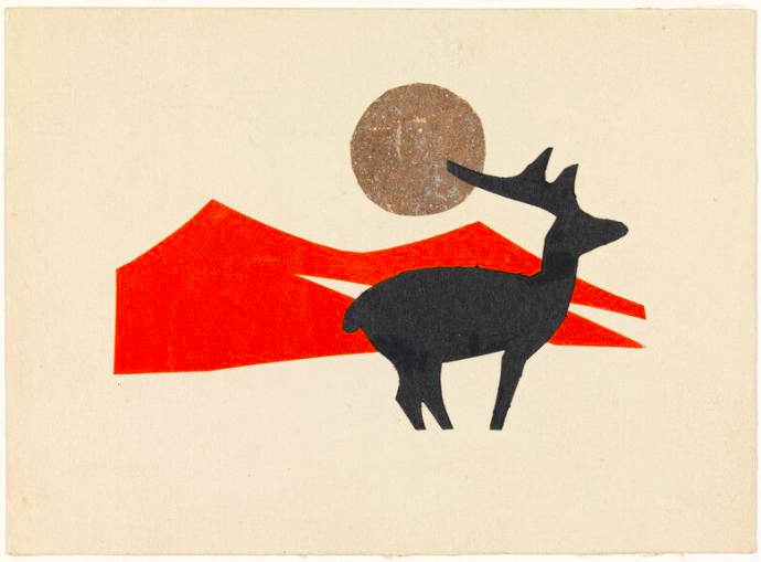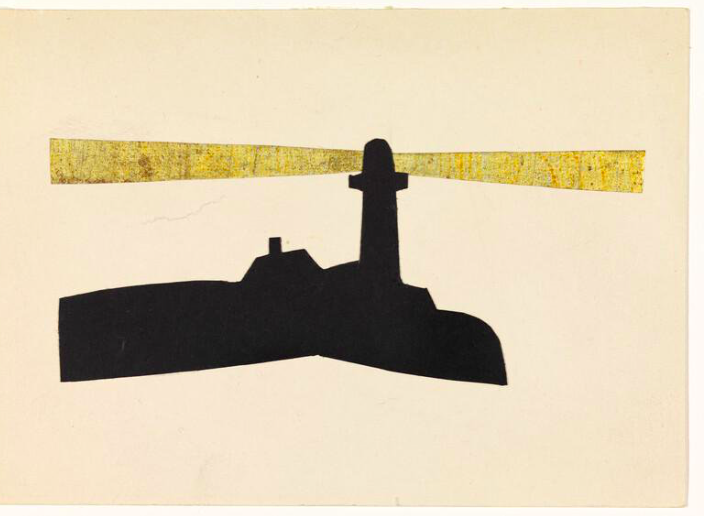 Two examples evoke scenes he painted near his summer home in Truro, Massachusetts. South Church in Truro was painted in 1930 shortly after the Hoppers first came to Truro, so it is possible that the card dates to that time. On the back of the card, Jo writes a cheery note that, “this is a fine old church of South Truro. E.H. has made a fine canvas of it.” The stark modern design uses colored paper for the moon, church, and churchyard. A second card evokes Hopper’s watercolor of Truro’s Highland Light (although Hopper painted many New England Lighthouses in his career). In this work he uses a strong black silhouette of the Highland Light coupled with a gold band of paper radiating from the tower.