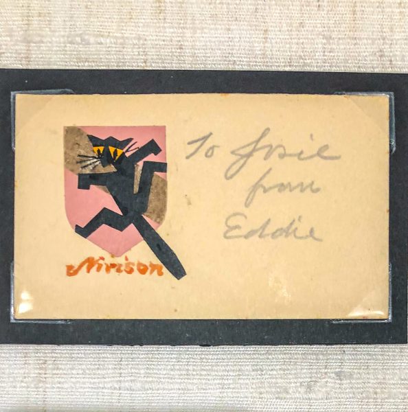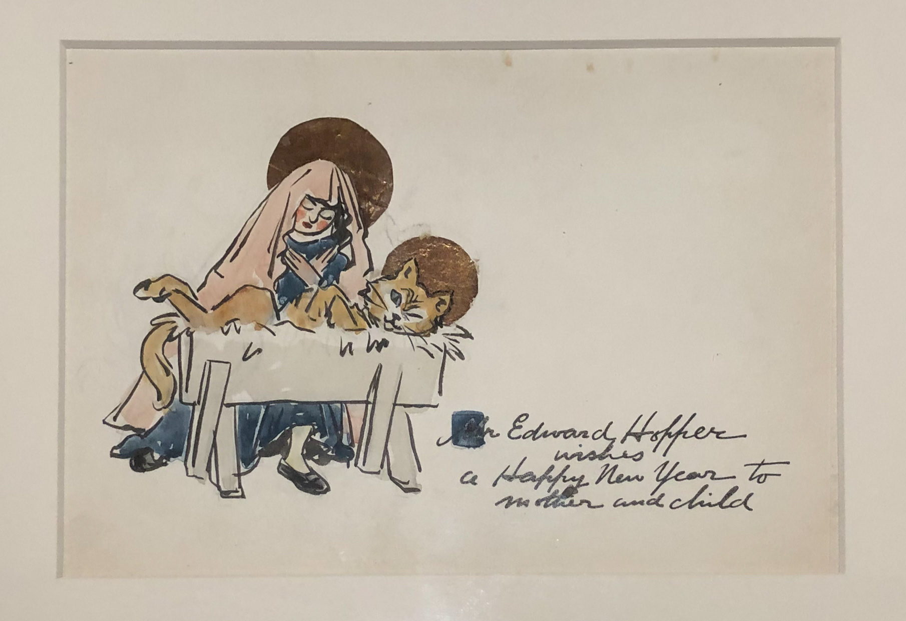 Carole Perry has also included a number of gift tags, including “Eddie,” “Josie,” “Lizzie” (Hopper’s mother), and “Marion” (Hopper’s sister), in the current exhibit. Josie was always fond of cats, and in her gift tag, Hopper has placed a cutout of cat on the Nivison (Jo’s maiden name) coat of arms. As Perry stated, the gift tags were Hopper’s way of showing warmth and affection for his family, warmth that he had a hard time communicating in any other way. In a sketch filled with warmth and humor dated December 12, 1949, Hopper addressed a card to his sister, Marion, with the inscription, “I am glad you are warm at last. Enclosed is a small Christmas gift.” He signed it “Ed.” The sketch may be of Josie (note the presence of the cat) and Ed dressed as Santa crouched over a floor grate. Their Washington Square apartment in New York City was heated by a single coal heater until 1960 and was an extremely cold place in winter.
