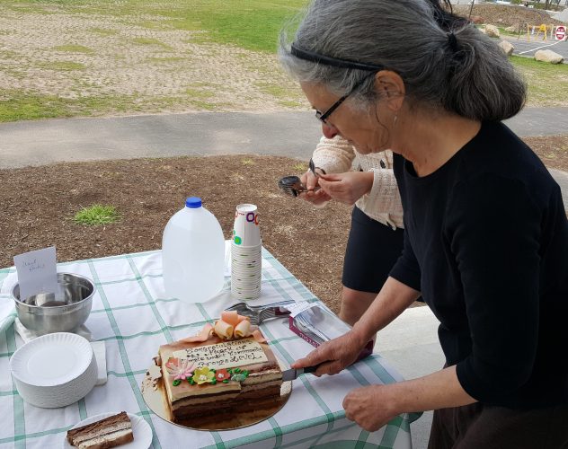 Village of Nyack Sustainability Coordinator Marcy Denker cuts a well-earned slice from a congratulatory “Bronze” cake donated by Didier & Dumas bakery on Main Street for the DEC celebration in Memorial Park. Denker has been leading Nyack’s charge to Climate Smart Community status. Keep up with her projects on the village’s Sustainability page, and please lend a hand if you can. (Photo: Susan Hellauer)