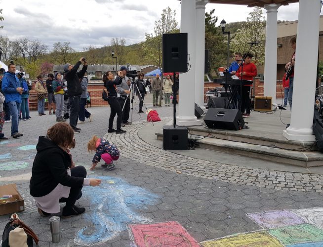 Artists, musicians, food vendors and non-profits celebrated Earth Day Saturday, April 27, at the Main Street gazebo in Nyack from 12n to 4p. Sponsored by Casa del Sol, Blue Rock School’s Summer Play Camp, Green Mountain Energy, and Clearway Energy, the festivities were hosted by the Nyack Chamber of Commerce and the Village of Nyack. Youngsters wield sidewalk chalk while the teen phenoms of Sons of Science set up a funk-rock vibe. (Photo: Susan Hellauer)