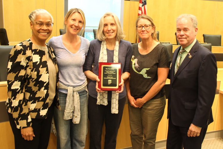 Rockland County Environmental Management Council Chair Natalie Patasaw (left) and Rockland County Executive Ed Day (right) present the Council’s 2019 “Edward Brophy Green Champion” award to Blue Rock School teachers (left to right) Ali Mindel, Lorraine Marden and Nicole Palitti, who accept it on behalf of the school and its students. Photo: John Lyon, courtesy County of Rockland