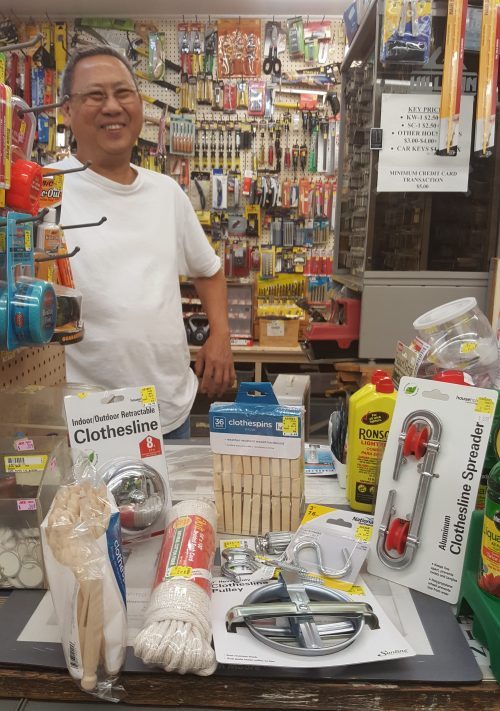 Joe Monterey, proprietor of Herb Lack Paint and Hardware at 124 Main Street, Nyack, NY, with an array of clothesline supplies. The author restored her clothesline twice in the last 22 years with supplies from Herb Lack. Photo: Susan Hellauer