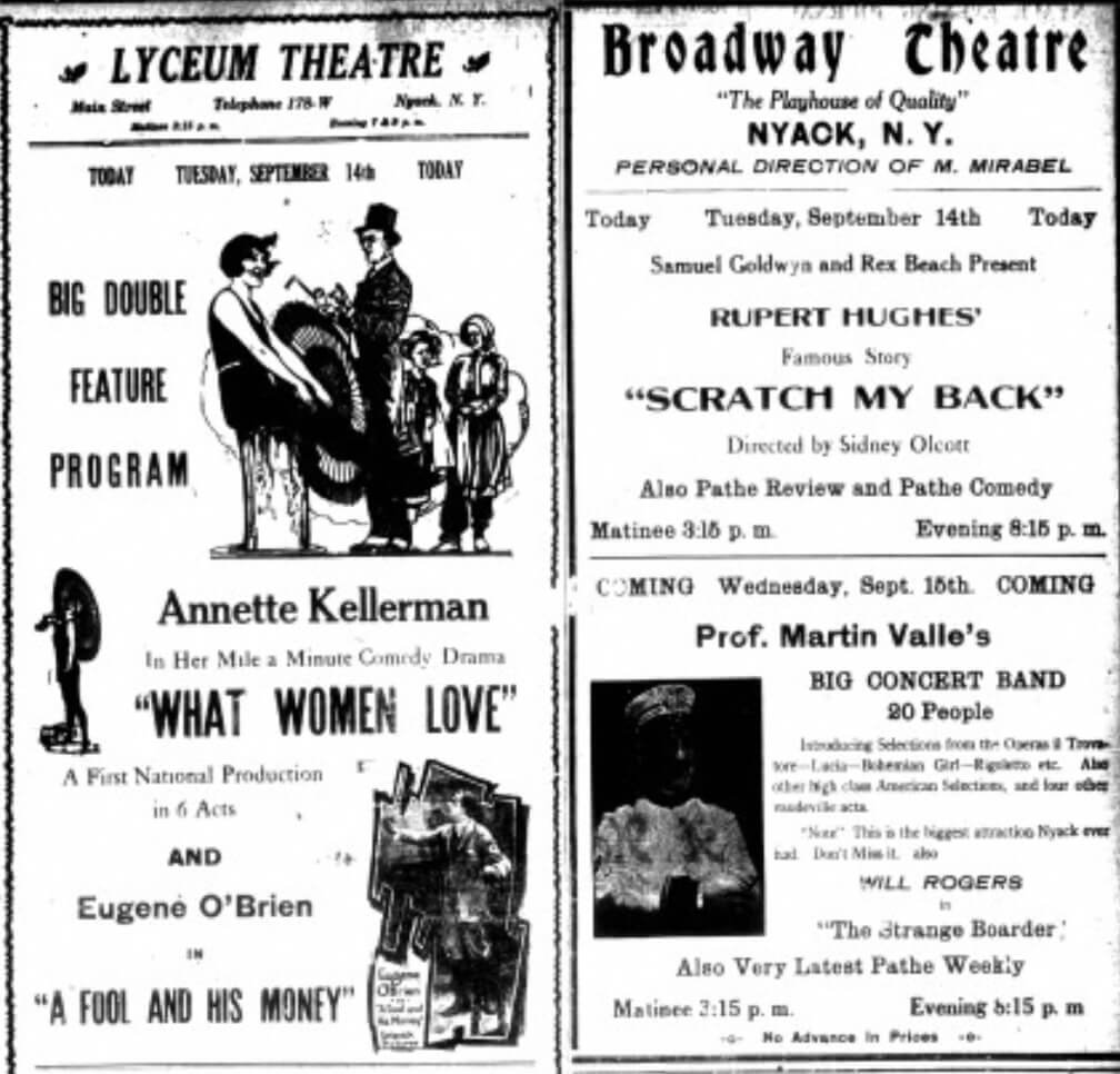 In the early years of cinema, movie theaters often paired short films with live vaudeville acts. Local papers paid more attention to the vaudeville performers than the films. A 1911 review in the Nyack Evening Star praised “high-class” performers like Alfredo, a boy violinist who wandered the stage in casual clothes; the dance duo Pike and Callen; and vocalist Mabel Ford. A second December review noted acts including Rose Telmer, a singing comedian; the comedy team of Kelly and Parks; and impersonator Walter Stead.