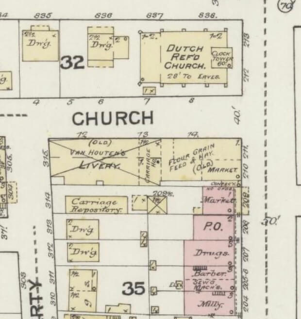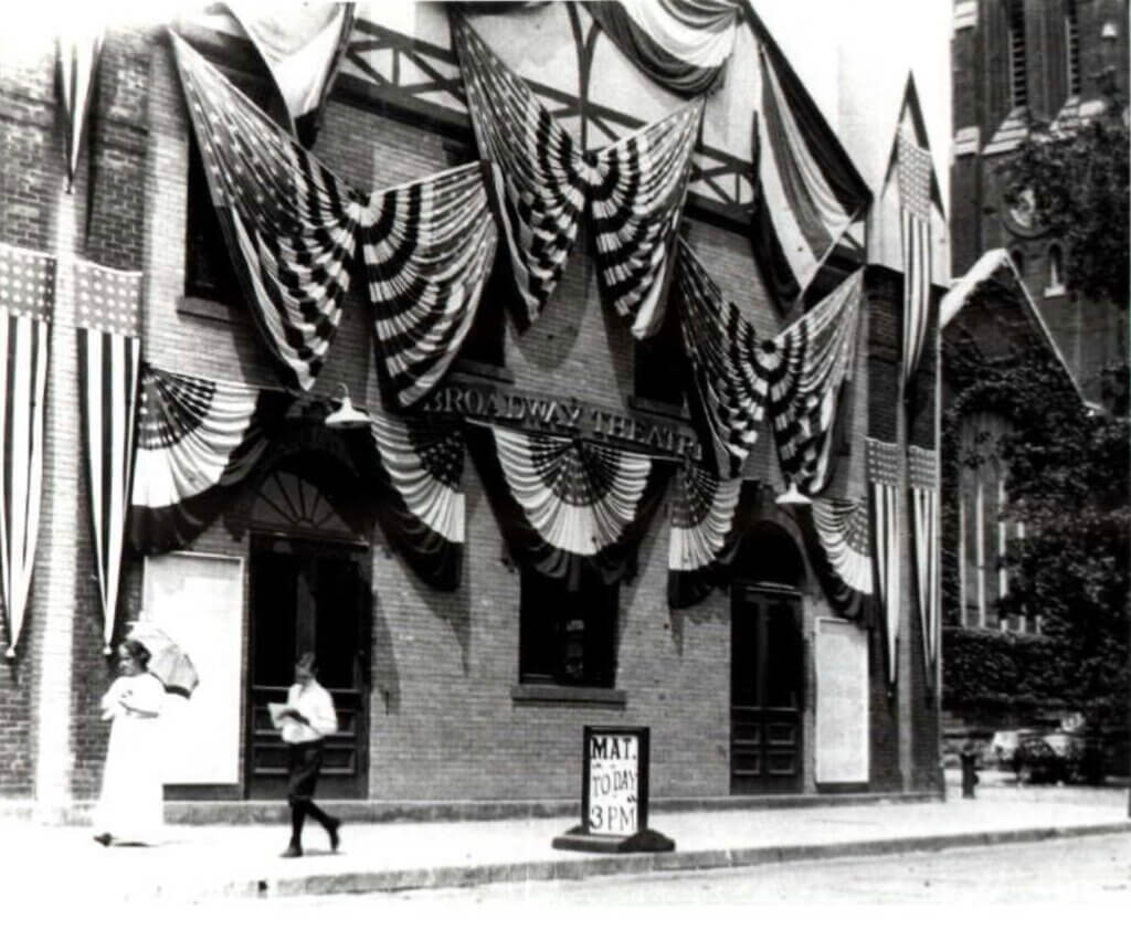 The site of the Broadway Theater has long been a hub of community activity. Before the Civil War, a feed and grain store stood at the Broadway and Church Street corner. Behind it, the Van Houten Livery occupied much of the block, while Christie’s Sleigh and Carriage Shop operated on Liberty Street.