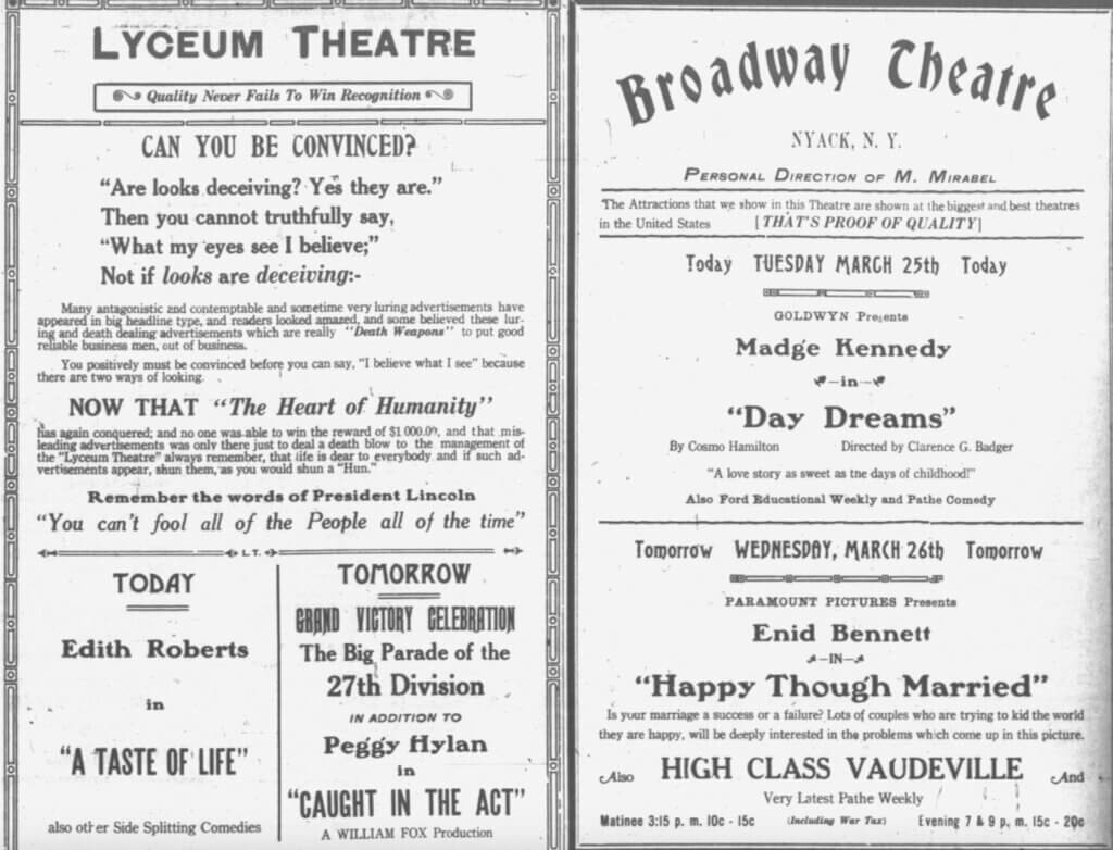 In early 1919, both theaters screened patriotic war dramas: D. W. Griffith’s Hearts of the World  starring Lilian Gish at the Broadway, and The Heart of Humanity at the Lyceum. The Griffith film received more press, featuring a synchronized score that local musicians could accompany live. Lyceum owner Ralph Krastner accused the Broadway Theater of false advertising and even offered $1,000 to anyone who could prove his claim wrong. No one did.