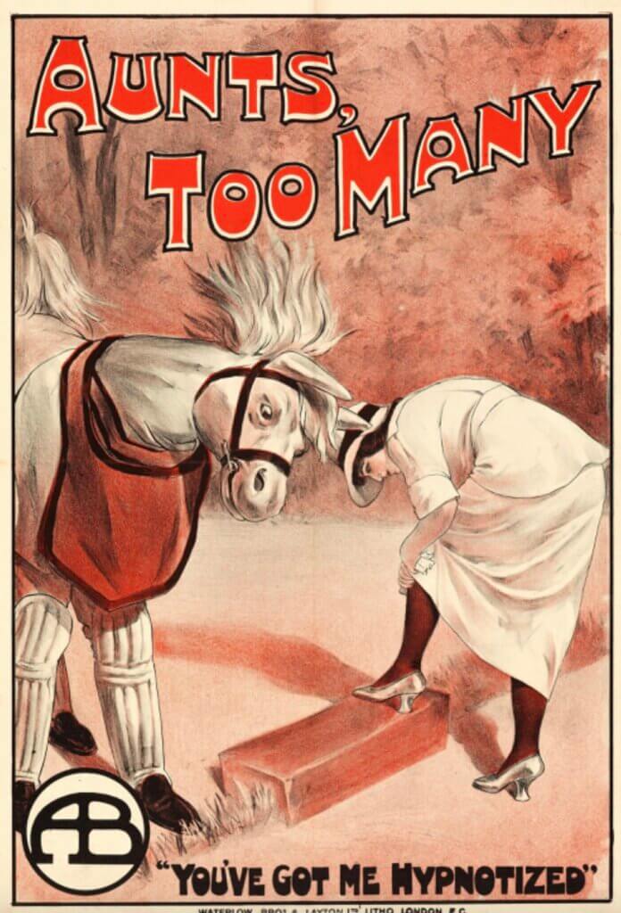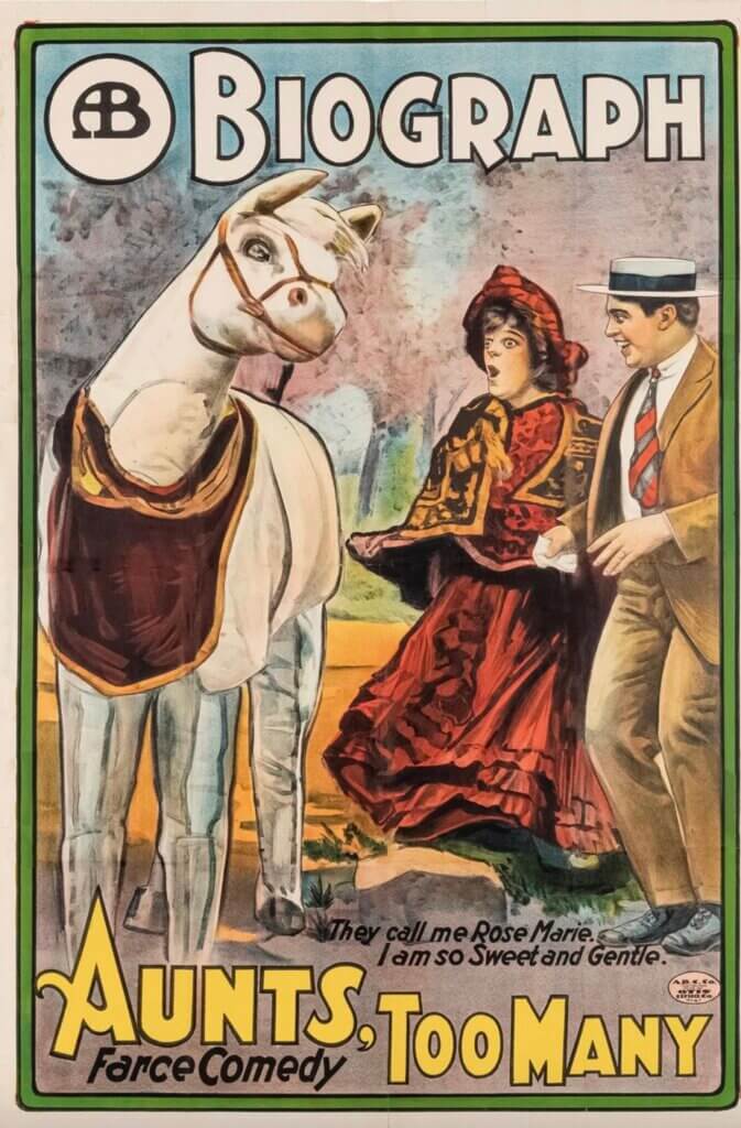 Advertising grew more aggressive after World War I as films became more polished and longer. Studios produced large-format posters, and star power became a draw. In a postcard showing the Lyceum, a poster is visible for Aunts, Too Many, a six-minute 1913 comedy.