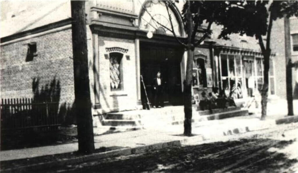 This shot of the Lyceum circa 1920 with a man, possibly the owner, at the front doors. The photo helps indicate the possible size of the interior. Next door is Hawvermale’s. Courtesy of the Nyack Library.