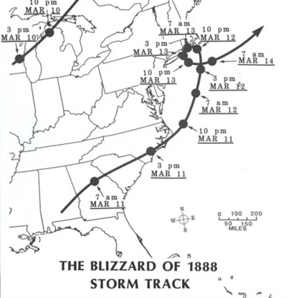Maps of the Blizzard of 1888 track and snowfall totals.