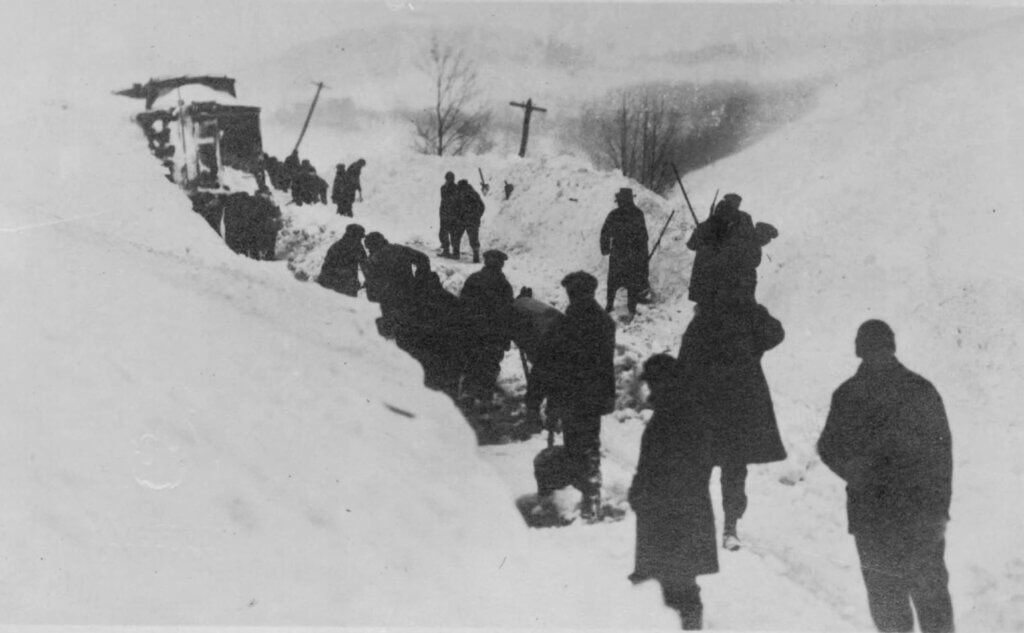 With no mechanical plows available, crews relied on shovels to clear tracks and restore rail service after the storm. Courtesy of the Nyack Library.
