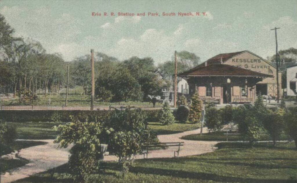 Postcard showing Kessler’s second livery on Chase Street across from the South Nyack train station and the village’s triangular park. Courtesy of the Nyack Library.