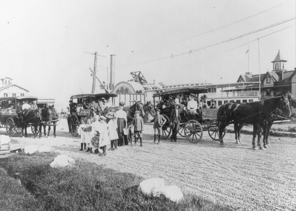 1890s photo showing the Nyack docks with carriages being loaded with summer guests bound for Mont Lawn. The steamboat appears to be the Chrystenah. The Nyack Rowing Association clubhouse is on the right. Courtesy of the Nyack Library.