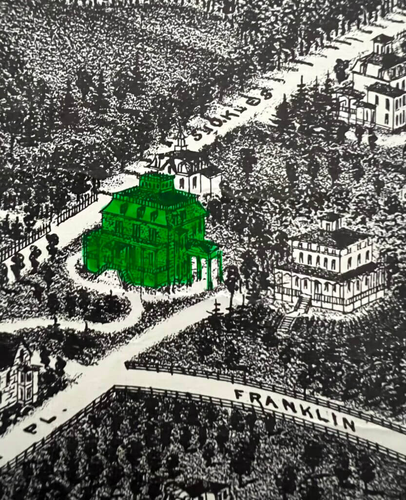 By contrast, architecturally, the villa reflected early Second Empire influence. Built of dark gray stone, it featured a high front porch, a broad lawn shaded by mature trees, and rustic seating that invited passersby to linger. A cupola rose above the attic story, and vines soon softened the stone exterior. To the north stood the Italianate De Cantillon residence. Together, the two houses formed an early enclave of wealth along Franklin Street, both crowned with cupolas and celebrated for their sweeping vistas of the Hudson.