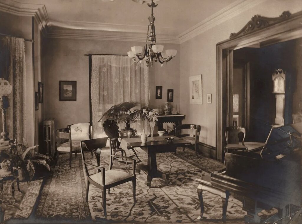 Inside, the villa included a parlor and dining room on one side and a sitting room and library on the other, trimmed in dark woods—black walnut alternating with ash ornamented with star motifs. The second floor contained numerous bedrooms. Unusual for its time, the house included a bathroom with hot and cold running water piped from the basement.