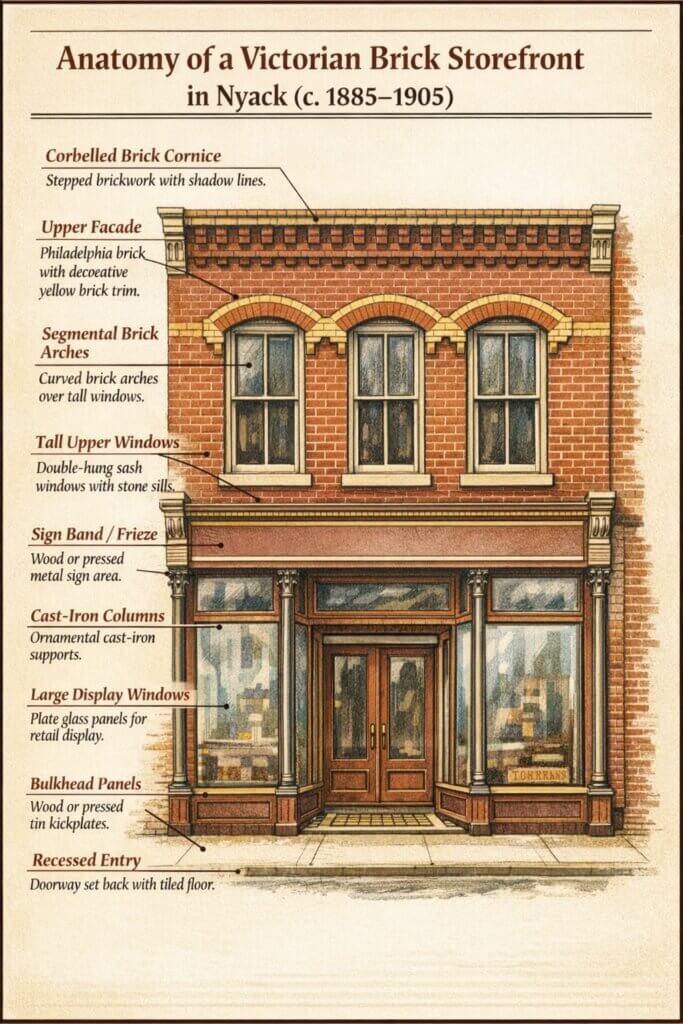 Nyack embraced this trend with enthusiasm. Working buildings relied on durable Haverstraw common brick, produced just upriver. Commercial façades increasingly featured Philadelphia face brick, prized for its deep red color and refined finish. Architects such as the Emery Brothers and masons like John Magee often combined the two. Philadelphia brick appeared on street-facing elevations. Haverstraw brick was used on sides and rear walls. The result was economical yet visually striking.