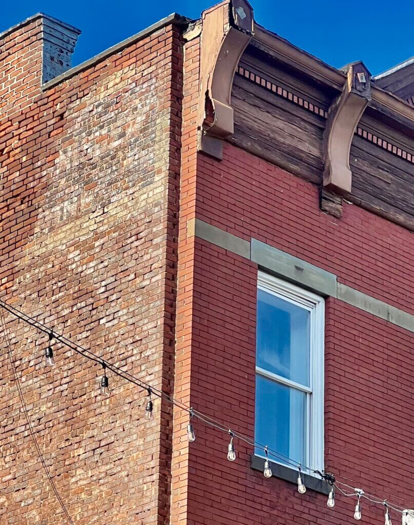 Philadelphia brick—a deep, uniform red face brick made from iron-rich clays—was the prestige material of the Gilded Age. Builders used it on front façades for its smooth finish, crisp edges, and decorative bonding patterns, while more utilitarian Haverstraw brick formed the side and rear walls. Its refined appearance gave Main Street storefronts a polished, urban character, even though many are now painted and several original brick cornices have been replaced with wood.