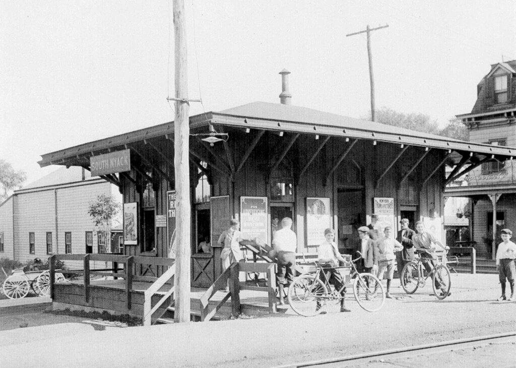 Bicycles were a common sight in Nyack at the turn of the 20th century, as seen here outside the South Nyack station, where young riders gather with their machines. Courtesy of the Nyack Library.