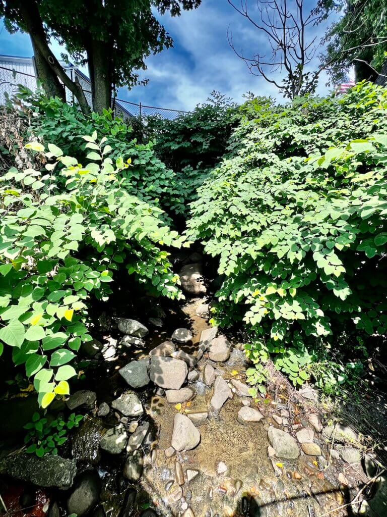 Water falls roughly six feet from the surrounding grade into a narrow channel. In summer, dense knotweed crowds the banks. The stream moves quickly through this confined space before vanishing again beneath pavement.