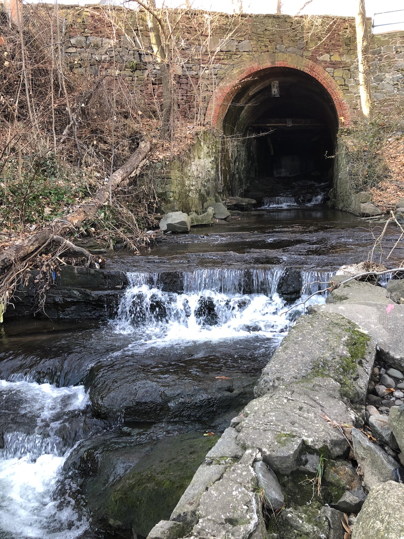 The brook passes beneath the 19th century arch bridge before entering the Hudson River. Photo by the Author.