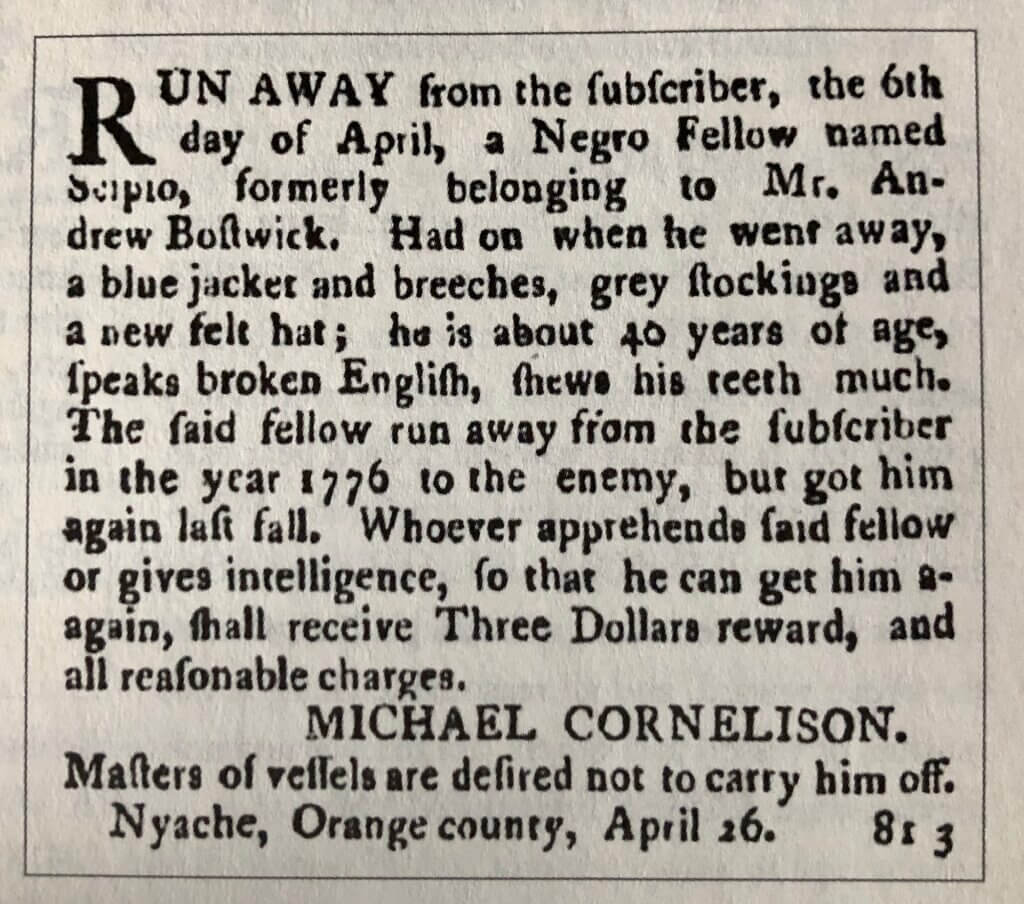 Runaway advertisements provide some of the most direct evidence of slavery in New York. In 1784, South Nyack landowner Michael Cornelison advertised for the return of Scipio, a man he had purchased years earlier. Scipio, about 40 years old, had previously fled to the British during the Revolutionary War, likely seeking freedom, and was again on the run. Cornelison offered a reward of $3.